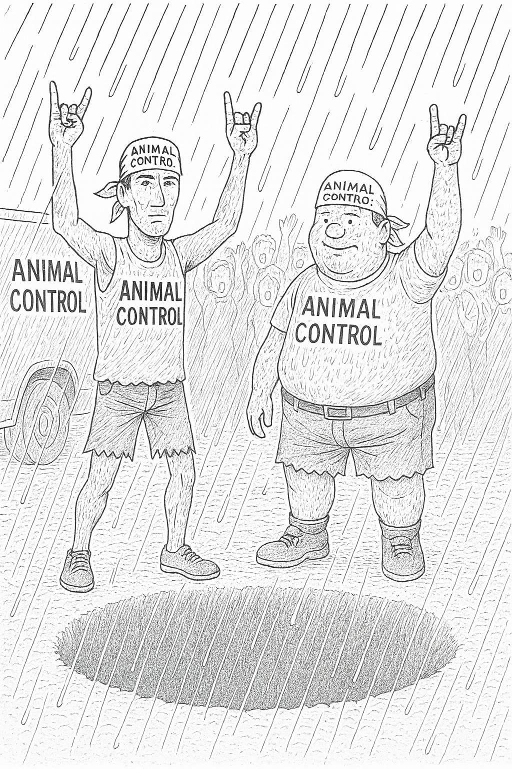 The tall one has a long, angular face and traces of a beard. The short one has the physique of a snowman with a large, round head resting atop a large, round middle. They both wear bandanas with an “Animal Control” logo to keep their hair in check. The bandanas are the only articles of clothing that are well-maintained, because, despite the uncertain conditions of the hole, the rest of their uniforms consist of cutoff shorts and shirts with no sleeves.